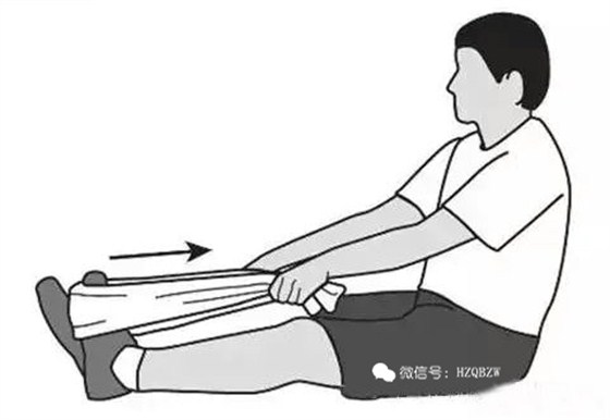 动作:坐于床上,双腿伸直。双手抓住大毛巾两端,勾住前脚掌。向后牵拉至足底或下推有拉紧感。